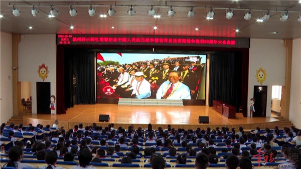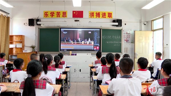 在桃州四小教育集團(tuán)北校區(qū),師生們齊聚一堂共同收看大會(huì)實(shí)況。步履鏗鏘的部隊(duì)方陣、氣勢(shì)恢宏的裝備陣列、以及抗戰(zhàn)老兵的感人畫(huà)面,深深感動(dòng)著每一位師生。