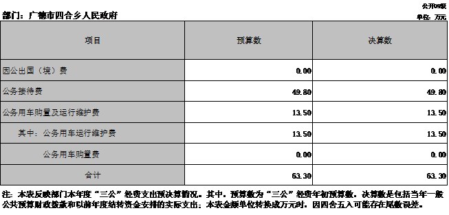 廣德市四合鄉(xiāng)人民政府2020年度一般公共預(yù)算財(cái)政撥款“三公”經(jīng)費(fèi)支出決算中,因公出國(guó)(境)費(fèi)支出決算0萬(wàn)元,占0%;公務(wù)接待費(fèi)支出決算49.80萬(wàn)元,占78.67%;公務(wù)用車(chē)購(gòu)置及運(yùn)行維護(hù)費(fèi)支出決算13.50萬(wàn)元,占21.32%。具體情況如下: