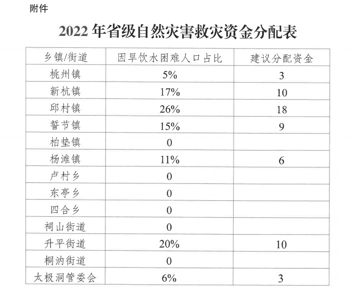 省財政廳、應急廳《關于下達 2022 年省級自然災害救災資金(于旱災害生活補助)的通知》(皖財資環(huán)[2022]997號)下達我市省級自然災害救災資金 59 萬元,用于補助我市解決城鄉(xiāng)居民用水困難,集中組織人員打井取水、買水送水等保障受災群眾生活用水的支出。經請示市政府同意,根據于旱災害期間各鄉(xiāng)鎮(zhèn)(街道辦)因旱飲水困難情況發(fā)放救災資金(資金分配見附件).現(xiàn)將有關事項通知如下: