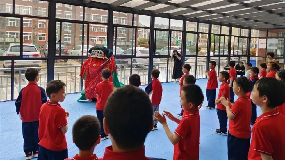 隨后第四代傳人李芳全、李芳喜給大家展示了四門見(jiàn)、三厥尾、倒順跟頭等技巧。圍觀的學(xué)生興趣連連,時(shí)不時(shí)為他們喝彩、叫好。接下來(lái)李芳全、李芳喜兩位傳承人親自教學(xué),指導(dǎo)學(xué)生動(dòng)作要領(lǐng),如何執(zhí)獅頭、擺獅尾,以及簡(jiǎn)單的動(dòng)作教學(xué),學(xué)生們一個(gè)個(gè)踴躍嘗試,進(jìn)入獅子進(jìn)行基本操作,瞧著一組組小獅子搖頭晃腦,時(shí)而前行時(shí)而躍身轉(zhuǎn)彎,現(xiàn)場(chǎng)氣氛十分熱烈。
