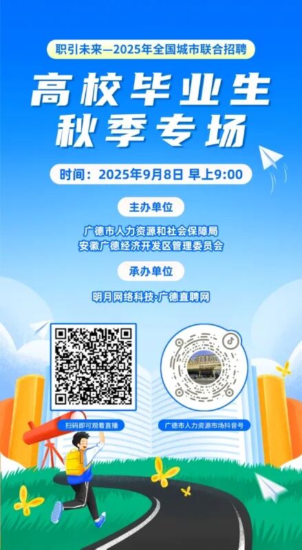 招聘通知:為助力高校畢業(yè)生及各類勞動(dòng)者求職就業(yè),9月8日上午, 廣德市2025年全國(guó)城市聯(lián)合招聘高校畢業(yè)生秋季專場(chǎng)直播招聘會(huì)準(zhǔn)時(shí)開播!掃描二維碼進(jìn)入直播間,優(yōu)質(zhì)崗位觸“屏”可得!