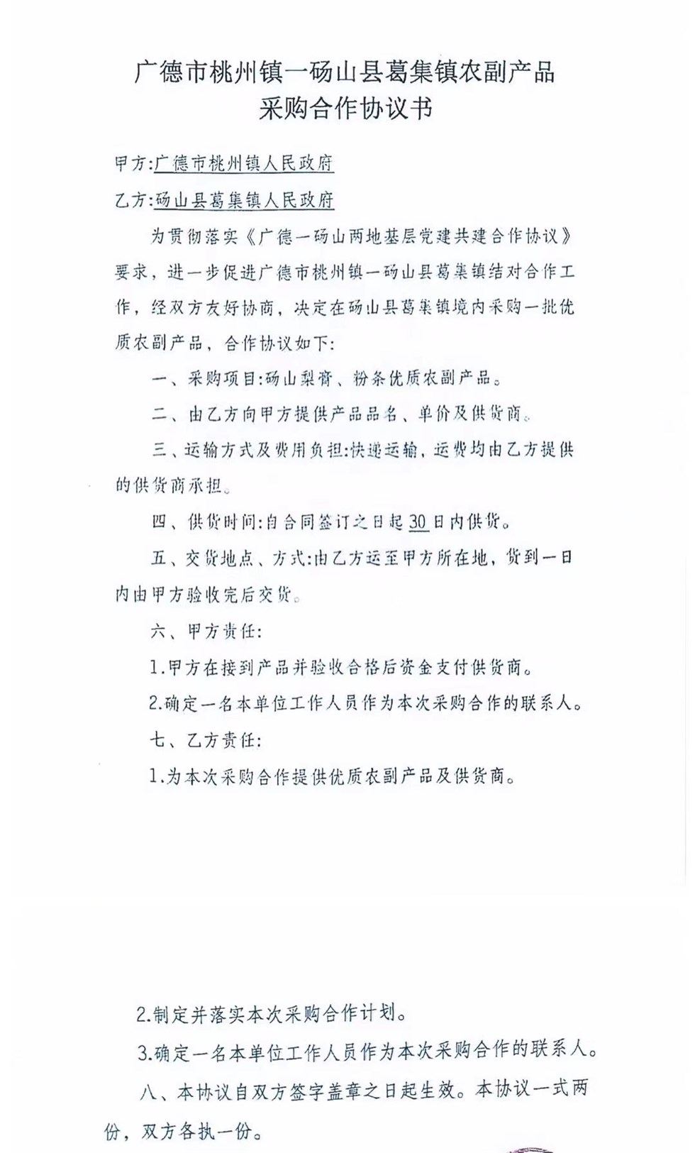 桃州鎮(zhèn)對口幫扶碭山縣葛集鎮(zhèn)農(nóng)副產(chǎn)品采購協(xié)議
