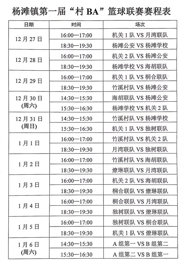 據(jù)了解,此次“村BA”籃球聯(lián)賽共有來(lái)自全鎮(zhèn)各村(場(chǎng))社區(qū)的10個(gè)參賽隊(duì)伍,約128名運(yùn)動(dòng)員參加。10支球隊(duì)共分AB兩組,第一輪采取小組循環(huán)賽,每小組前兩名進(jìn)入第二輪半決賽。