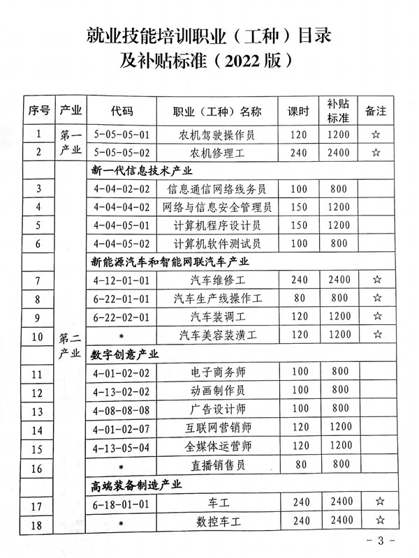 | 名稱: | 就業(yè)技能培訓(xùn)( 工種)目錄及補(bǔ)貼標(biāo)準(zhǔn)( 2022 版) | 文號(hào): | 無(wú) |
