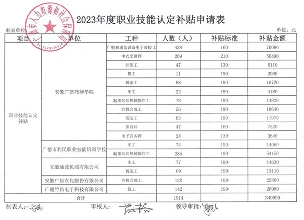 廣德市2023年度職業(yè)技能認定補貼申請表(含楊灘鎮(zhèn))
