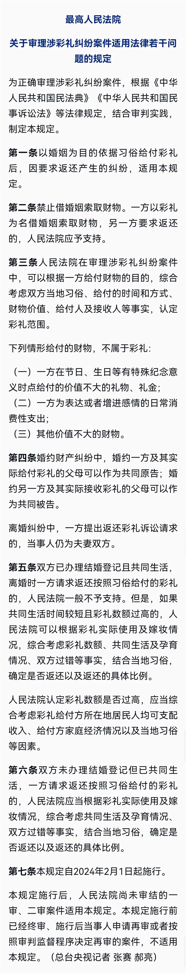 近年來,多地彩禮數(shù)額持續(xù)走高,涉彩禮糾紛案件數(shù)量呈上升趨勢(shì),為妥善審理涉彩禮糾紛案件、平衡雙方利益,最高人民法院今天(1月18日)發(fā)布審理涉彩禮案件司法解釋,針對(duì)司法實(shí)踐中存在的彩禮認(rèn)定范圍、彩禮返還原則、訴訟主體資格等重點(diǎn)難點(diǎn)問題予以規(guī)范。