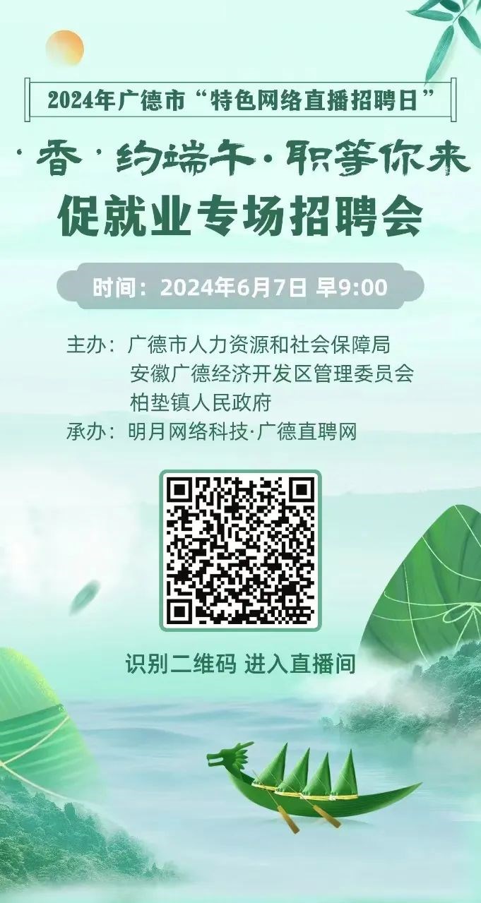 廣德市人社局聯(lián)合柏墊鎮(zhèn),將于2024年6月7日(周五)上午八點(diǎn)半,在柏墊社區(qū)養(yǎng)老服務(wù)中心(柏墊農(nóng)商行旁)舉辦柏墊鎮(zhèn)“‘香’約端午·職等你來”促就業(yè)專場招聘會(huì),利用“線下+直播”方式,為企業(yè)、求職者、人力資源公司提供一個(gè)交流平臺(tái),誠摯地邀請您參加!報(bào)名電話:0563-6079039。