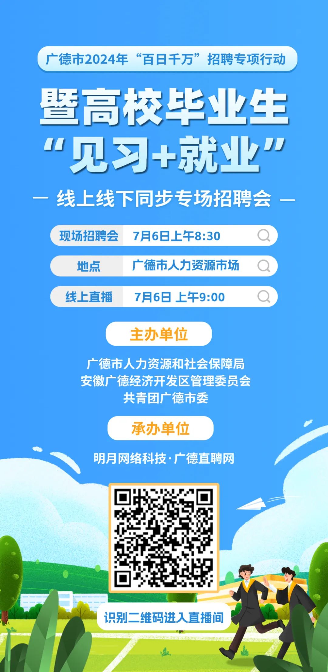 招聘通知:為助力高校畢業(yè)生及各類勞動者求職就業(yè),7月6日上午,廣德市2024年“百日千萬”招聘專項行動暨高校畢業(yè)生“見習+就業(yè)”專場招聘會線上線下同步開展啦!