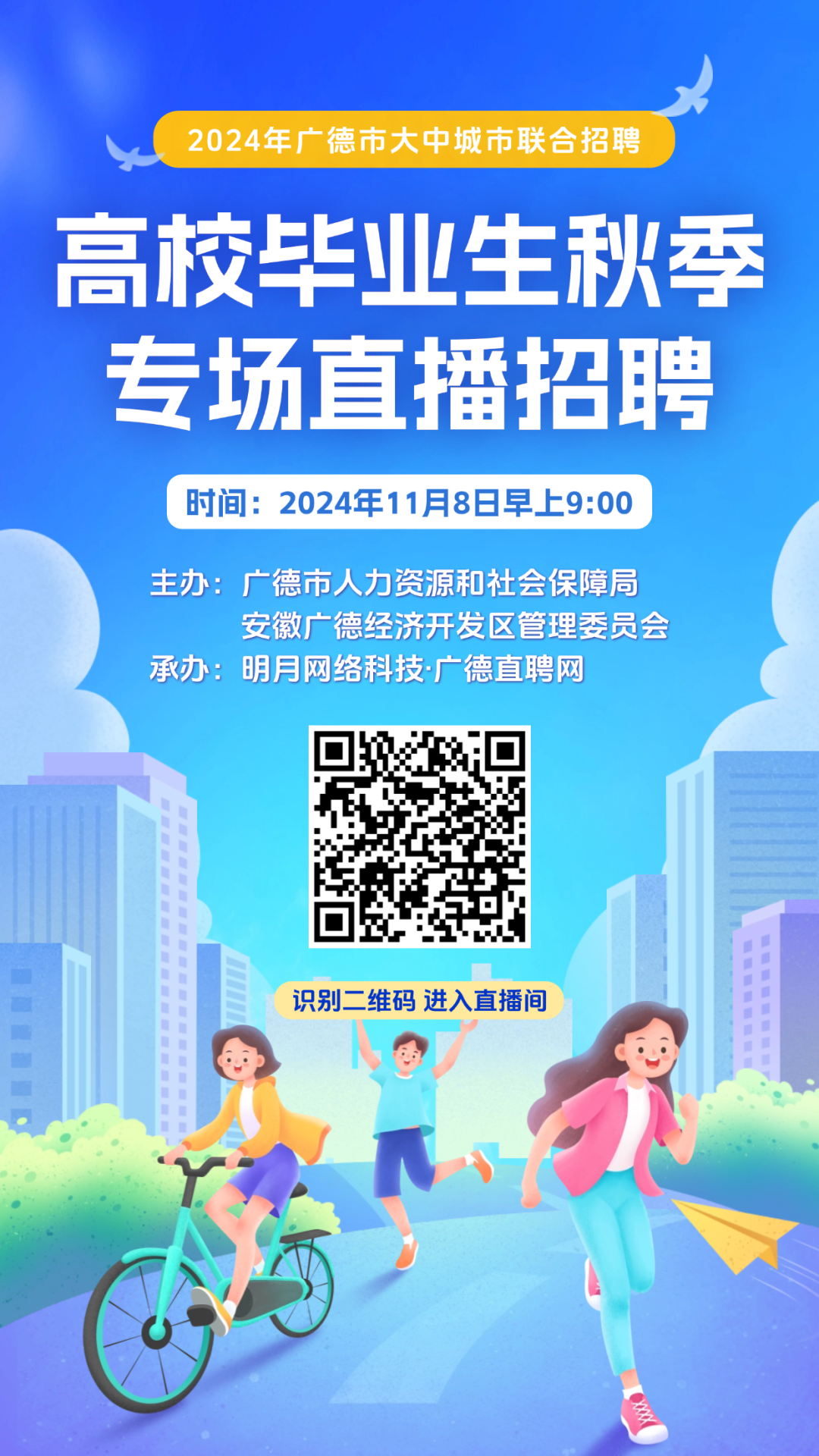 招聘通知:為助力高校畢業(yè)生及各類勞動者求職就業(yè),11月8日上午,廣德市2024年廣德市大中城市聯(lián)合招聘暨高校畢業(yè)生秋季專場直播招聘會開播啦
