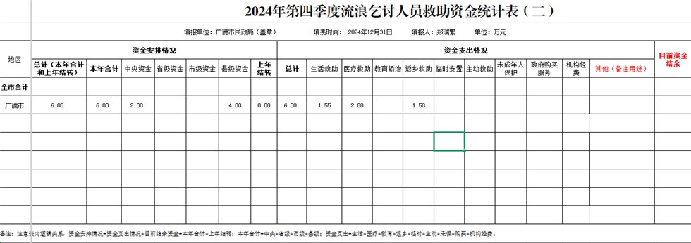名稱: 2024年第四季度廣德流浪乞討人員救助資金統(tǒng)計表 文號:
