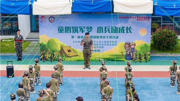 街道退役軍人服務(wù)站精心挑選四位優(yōu)秀退役軍人到現(xiàn)場指導(dǎo)孩子們進(jìn)行嚴(yán)格的體能訓(xùn)練。教官給孩子們進(jìn)行了隊(duì)列展示、格斗軍體拳等軍事動作。利落的動作、有力的步伐,孩子們發(fā)出一陣陣驚嘆,直呼“教官叔叔太酷了”立志要向教官們學(xué)習(xí)?!吧韵ⅰ薄傲⒄薄熬炊Y”,伴隨著一聲聲響亮的口令,每個動作小兵們都做的無比認(rèn)真,專注的眼神、威武的姿勢,處處盡顯小英雄的模樣。翻山越嶺、軍事障礙、追擊炮等這些在電視上、電腦中出現(xiàn)的場景小兵們都一一體驗(yàn),小小兵們提高了攀、爬、跳、躍能力和身體的靈活性,克服了膽怯和恐高的心理,增強(qiáng)了體質(zhì)。