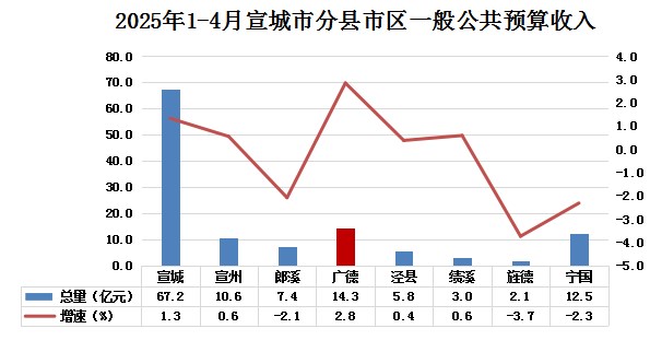 4.財(cái)政。1-4月,全市實(shí)現(xiàn)一般公共預(yù)算收入14.3億元,同比增長(zhǎng)2.8%,4月當(dāng)月實(shí)現(xiàn)一般公共預(yù)算收入3.4億元,當(dāng)月同比增長(zhǎng)12.7%;稅收收入累計(jì)完成9.5億元,占一般公共預(yù)算收入比重為66.4%。