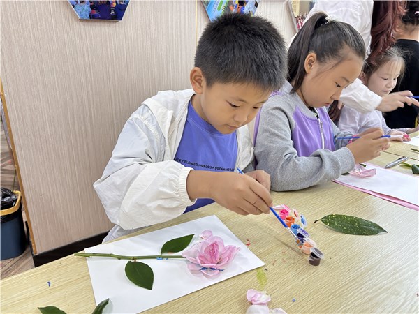 隨后進入“花瓣立體畫”制作環(huán)節(jié),志愿者提前備好玫瑰花瓣、卡紙及安全顏料,演示核心方法:在卡紙對應位置涂少量顏料,既固定花瓣又作底色。小朋友自由發(fā)揮想象,拼貼出“立體玫瑰”“水墨風花葉畫”“水生植物小花”等作品。志愿者全程巡回指導,針對花瓣易掉問題,教孩子調整顏料涂抹厚度,助力完成創(chuàng)作。