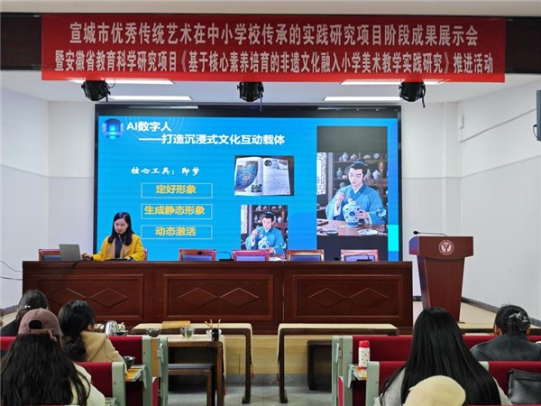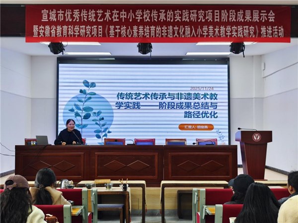 最后,廣德市教師發(fā)展中心美術(shù)教研員胡俊燕老師圍繞講座主題“傳統(tǒng)藝術(shù)傳承美術(shù)教育實踐——階段成果總結(jié)與路徑優(yōu)化”,對傳統(tǒng)藝術(shù)傳承與非遺美術(shù)教學(xué)實踐成果進行總結(jié)。她客觀分析了當前教學(xué)中存在的各類問題,并針對性地提出加強校際合作、開展教師培訓(xùn)交流、借助信息技術(shù)拓寬教學(xué)渠道等建議,為后續(xù)教學(xué)創(chuàng)新發(fā)展指明方向。