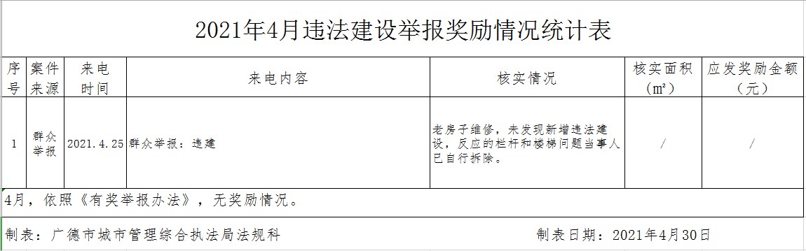 廣德市2021年4月份違法建設(shè)舉報(bào)獎(jiǎng)勵(lì)情況
