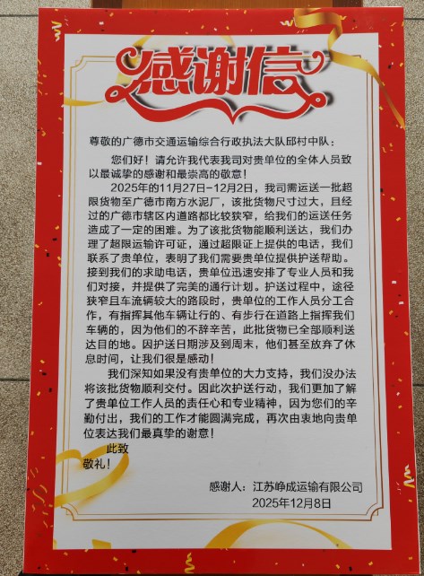 “護送過程中,途經(jīng)狹窄且車流量較大的路段時,貴單位的工作人員分工合作……因為他們的不辭辛苦,此批貨物已全部順利送達目的地?!麄兩踔练艞壛诵菹r間,讓我們很是感動!”企業(yè)在感謝信中,對執(zhí)法隊伍的責任心與專業(yè)精神給予高度評價。一面錦旗、一封感謝信,不僅是對一次護航任務(wù)的肯定,更是對廣德交通執(zhí)法大隊“黨建+執(zhí)法”融合模式的認可,是執(zhí)法為民、溫情服務(wù),持續(xù)優(yōu)化營商環(huán)境,保障路網(wǎng)暢通的生動注腳。