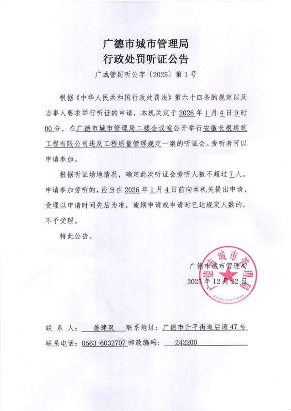 廣德市城市管理局行政處罰聽證公告