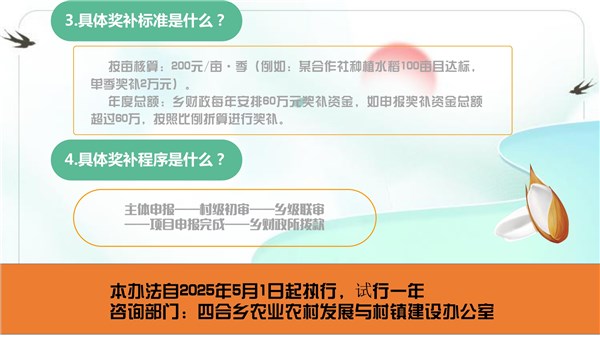 | 名稱: | 【圖片解讀】四合鄉(xiāng)糧食規(guī)模種植獎補(bǔ)辦法(試行) |